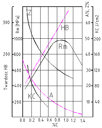 Zwiększenie zawartości węgla zwiększa wytrzymałość na rozciąganie Rm i zmniejsza plastyczność stali. Maksymalną wytrzymałość osiąga stal przy zawartości ok. 0,85% węgla. Przy większej zawartości węgla wytrzymałość zmniejsza się na skutek pojawiania się coraz większej ilości cementu wtórnego, który wydziela się na granicach ziaren.